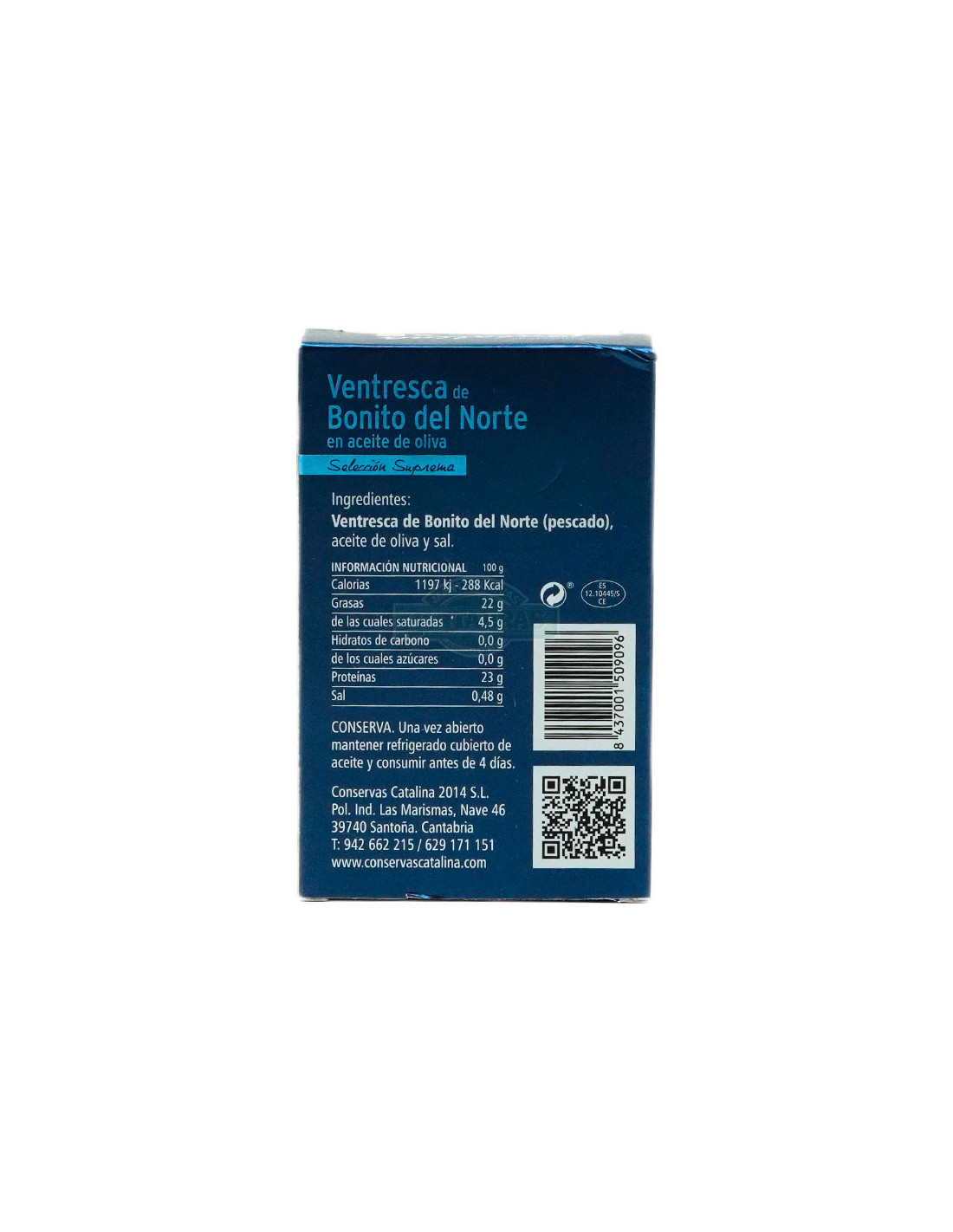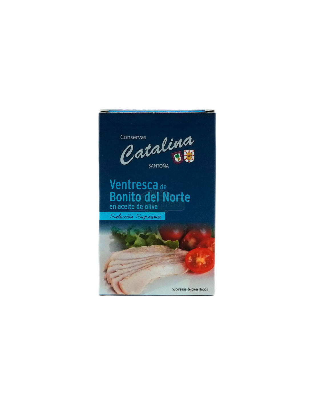 La ventresca de bonito del norte selección suprema Catalina es, junto a la anchoa, su producto estrella. De las mejores piezas seleccionadas tras la costera en el Cantábrico, se obtiene esta magnífica ventresca de delicioso sabor.Peso escurrido: 85 gramos.