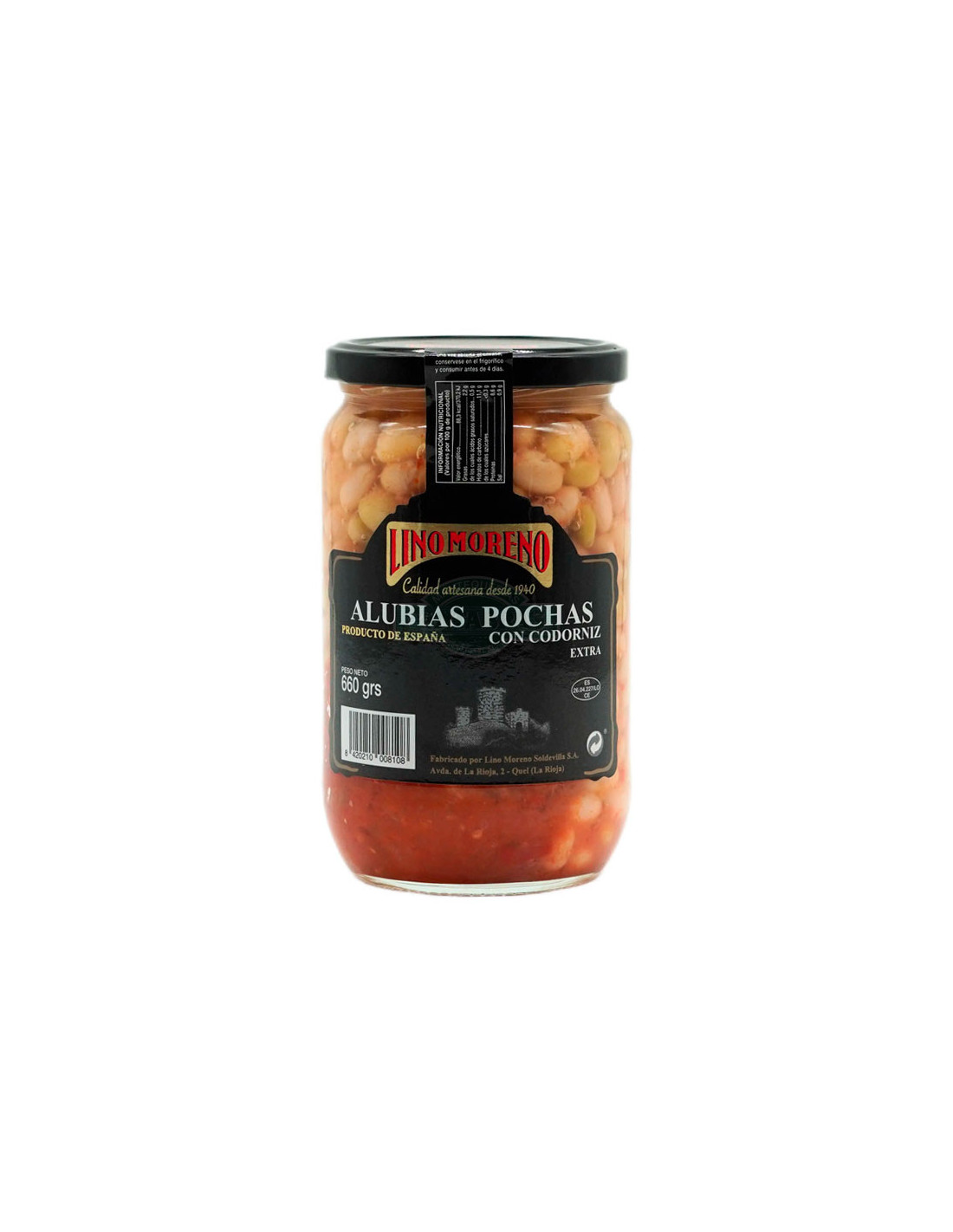 Excelente plato típico de la gastronomía riojana. Desde 1940, esta empresa trabaja sin descanso para ofrecer exquisitas conservas vegetales y platos preparados. Lino Moreno es sabor y tradición, la de una cocina de siempre, la de toda la vida. Las alubias pochas extra con codorniz se envasan sin conservantes ni colorantes.
