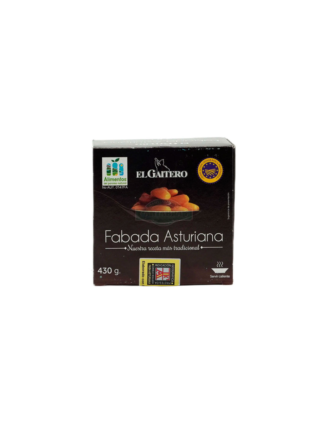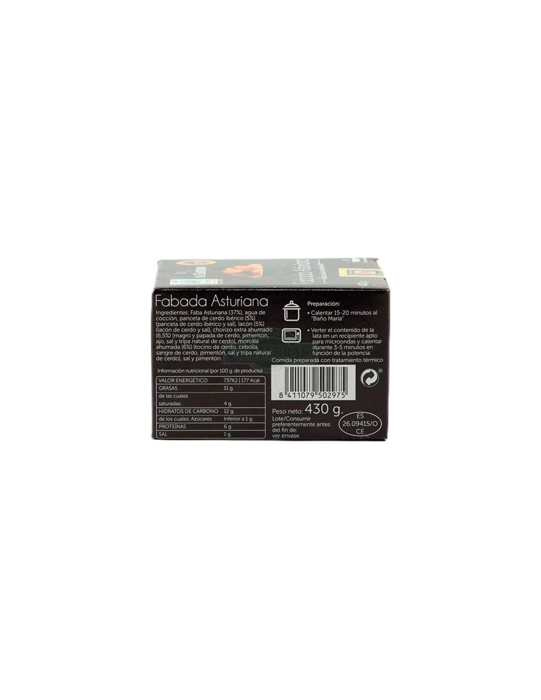 Elaborada a base de Faba Asturiana I.G.P. y compango asturiano (chorizo, morcilla y lacón), cocinada, envasada en recipiente metálico con cierre hermético y sometido a un proceso de esterilización comercial que garantiza su conservación en condiciones de temperatura ambiente durante su almacenamiento.