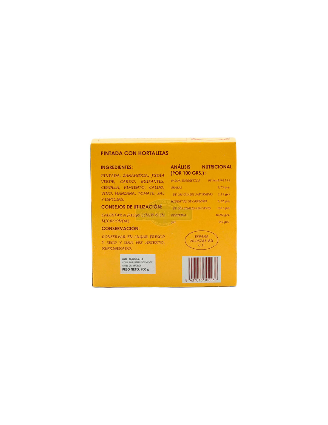 La Fonda del Prado elabora una deliciosa receta de Pintada Provenzal con Verduras, un excelente producto cocinado de manera totalmente artesanal, con todo el cuidado y con el saber y la experiencia más de 50 años. En el interior de la lata encontramos media pintada guisada, acompañada de una deliciosa menestra de verduras. Todo un manjar.