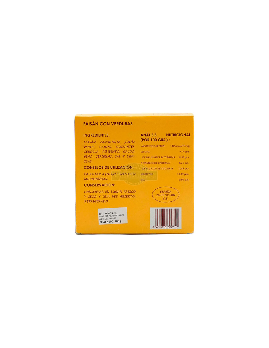 Entre los excelentes productos elaborados de manera totalmente artesanal por la Fonda del Prado, nos encontramos con este delicioso Faisán Provenzal con Verduras, realizado con todo el cuidado y la experiencia de más de 50 años en su granja de Villalba de Duero, Burgos. La lata contiene medio faisán guisado junto a deliciosas y frescas verduras.